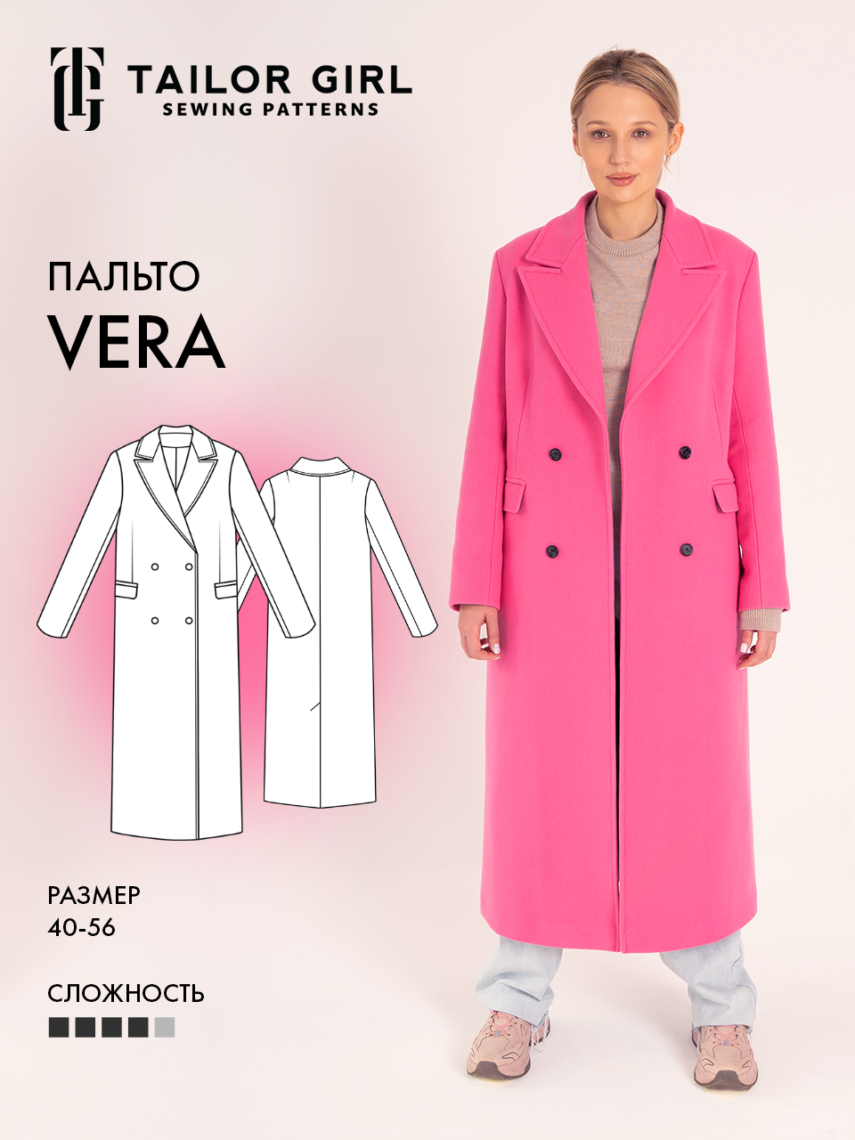 ПАЛЬТО «VERA» Пальто умеренного объёма, прямого силуэта. На полочках нагрудные вытачки переведены в талиевые вытачки и линию кармана